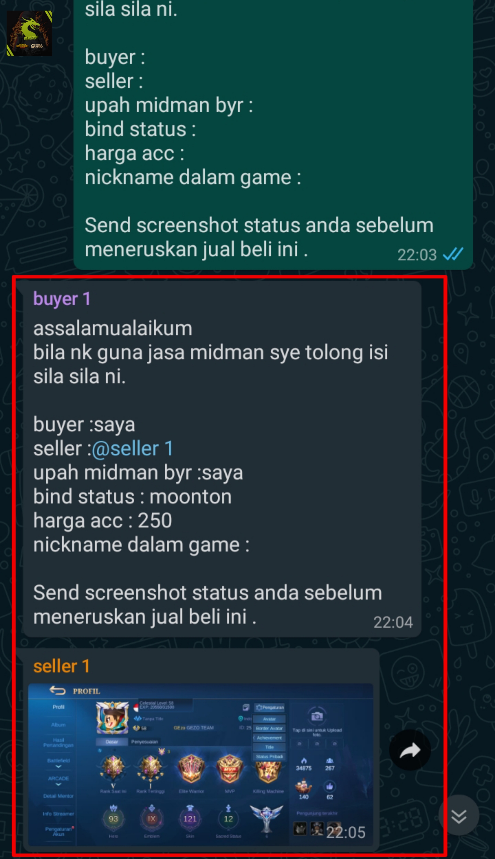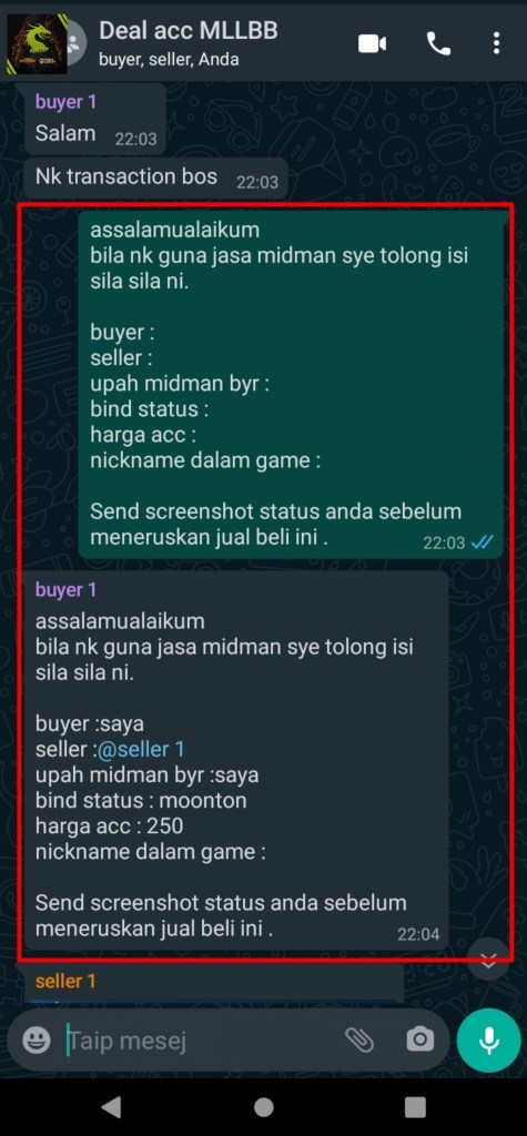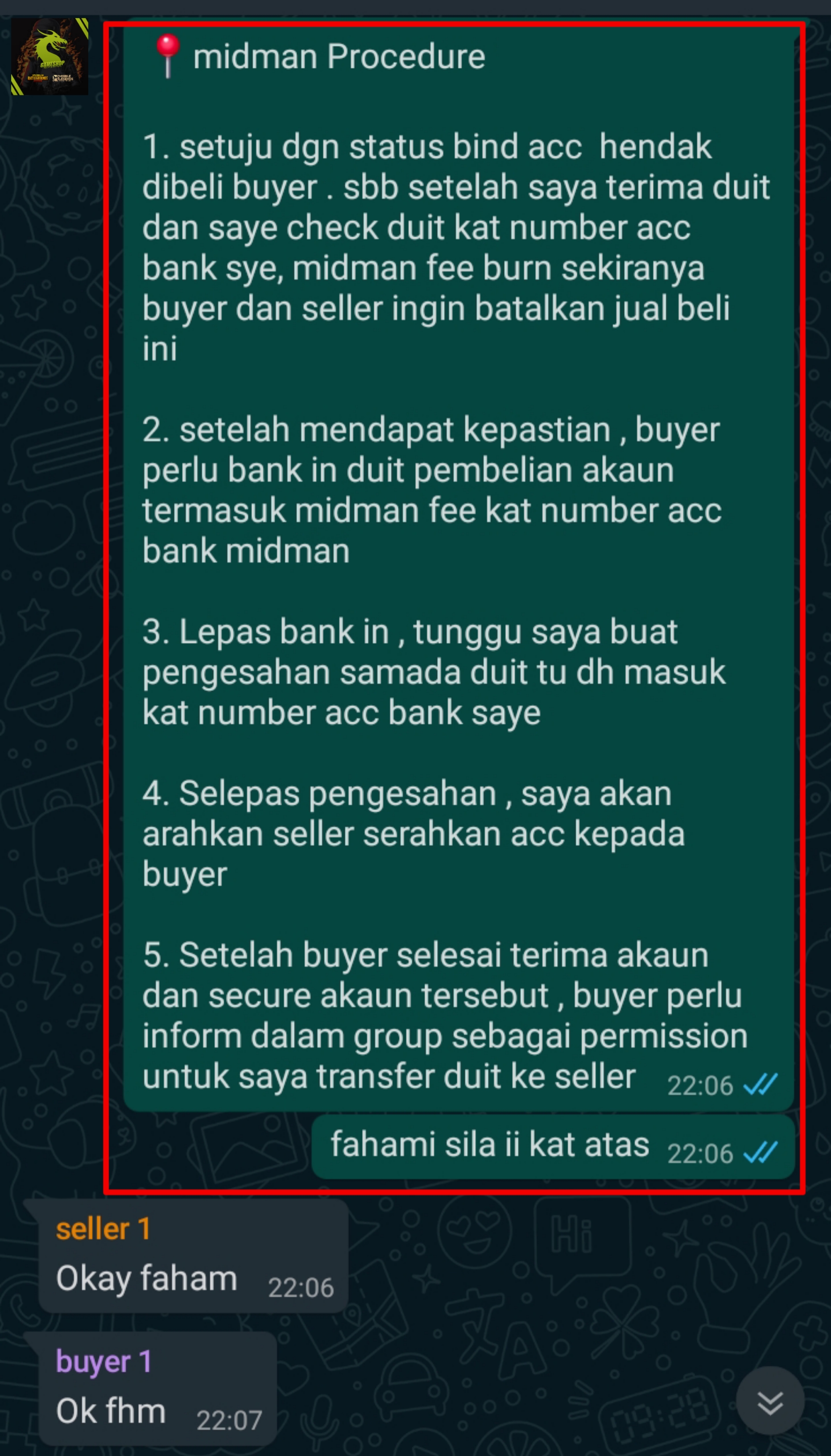 selepas saya konfrim bila buyer dah bank in silakan seller hantar akaun yg di jual dekat buyer dan buyer konfrim bila akaun dah settle