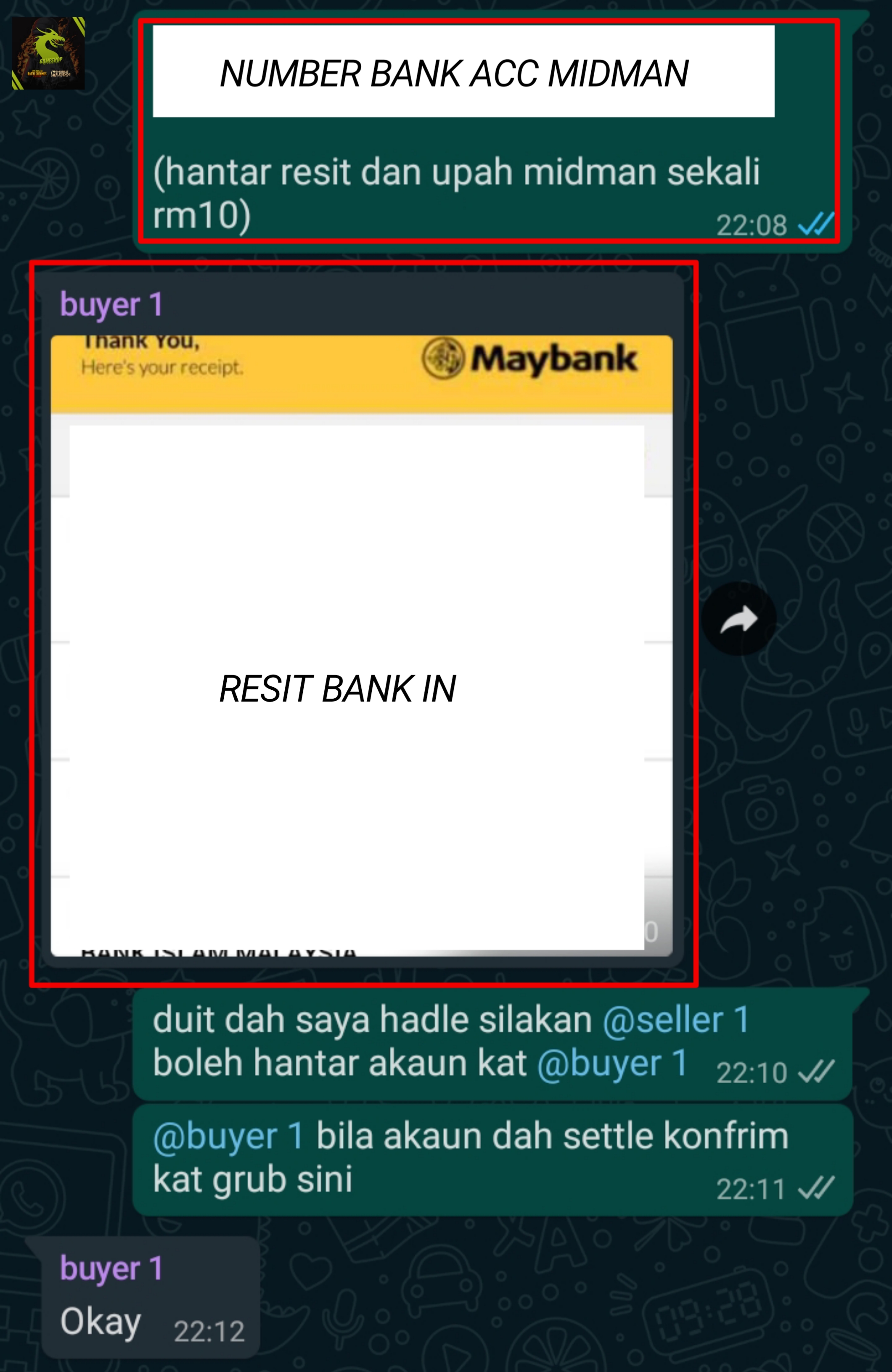 saya bagi number acc bank saya dan silakan buyer bank in selepas dah bank in, buyer harap hantar resit bank in dekat grup transaction