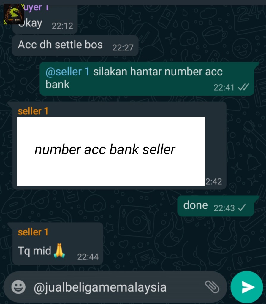 buyer dah konfrim bila akaun dah settle dekat grup transaction seller silakan hantar number acc bank dan saya bank in dekat number acc bank seller